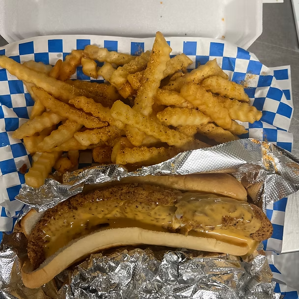 Crispy golden-fried US farm-raised catfish fillet served on a soft hoagie bun. Served with fries.